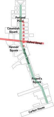 Nash was not, however, able to complete the processional path as designed. Two major problems cropped up. First, homes on the east side of Cavendish Square would have to be torn down to make way for the new route, and the residents vociferously objected. Nash was thus forced to redesign it, moving the path further to the east and creating an abrupt kink or “wiggle” in the street.