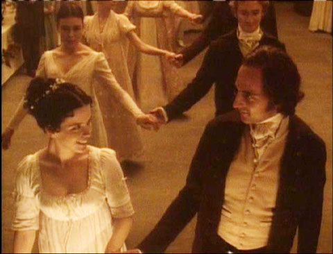 Both film adaptations conclude the ball with a stately, but sensual, dance as the pair move gracefully together, suggesting their mutual attraction and physical compatibility. Both directors use the same music—“Mr. Beveridge’s Maggot,” from Playford’s English Dancing Master—employed for Elizabeth Bennet’s dance with Mr. Darcy at the Netherfield Ball in the 1995 BBC/A&E version of Pride and Prejudice. As Steven Prince observes, “Movie music emphasizes emotional effects most often by direct symbolization: the music embodies and symbolizes an emotion appropriate to the screen action” (188). The appeal of this ravishing melody represents the romantic impact of the pair’s first dance together.