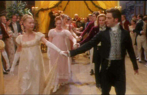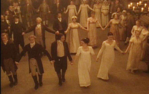 Clearly, dance and ballroom scenes are crucial to courtship in Jane Austen’s novels. As Vivien Jones writes, “Scenes set at balls and assemblies are an important structural feature of all Austen’s novels. In such scenes, she subtly explores the pleasures and pains of dancing, and of the matchmaking and social mixing ritualized in its elaborate rules of polite behaviour” (389). Sue Birtwistle, the producer of the 1995 BBC adaptation of Pride and Prejudice, states in her chapter on “Dancing” in The Making of Pride and Prejudice, “In Jane Austen’s time dancing was an integral part of social life. Given her own love of dancing and the crucial role it played in courtship, it is no surprise that she set many key scenes in the book at dances or balls” (67). And Cheryl Wilson, writing about Persuasion, suggests, “Austen concentrates on the nature of the dance itself and lets its character inform her novel, which moves like the kaleidoscopic patterns of a country-dance.” The ballroom constituted a refined type of marriage market. Allison Thompson says, “an assembly was more than just a dance; it was a prime area for young ladies and gentlemen to get to know each other.” Molly Engelhardt points out that it was at the ball, “within the disciplined realm of courtship, that young people could experiment with the romance plot before ultimately determining it” (239). Ball scenes also render Austen novels highly cinematic, as recent films can verify. So it is no surprise that film directors make the most of Austen’s dance scenes, for they, in turn, render the movie adaptations scintillating. As Linda Wolfe states, “For many film-goers and television watchers, the stately dancing in the recent spate of Jane Austen dramatizations stirred a touch of culture envy: a longing for a presumably lost Eden of elegance, for forms of social intercourse less brash and brazen than our own.”