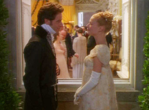 Both directors heighten the importance of Mr. Knightley’s rescue of Harriet by moving directly from the dance to Emma’s conversation with Mr. Knightley about the Eltons’ hostility. McGrath’s version is more creative, as it has the pair move outdoors for this moonlit scene. They are framed against a window through which the ballroom is visible, suggesting the connection between private and public realms, the potential lovers’ intimacy and their social context. In the case of both adaptations, the crucial rejoinder, “‘Brother and sister! No, indeed!’” is delivered quite suggestively.