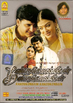 Kandukondain Kandukondain, however, started out as a distinctly local, not global, film. The movie was conceived originally for a south Indian audience, and the focus in the film is entirely on Tamil culture, with little desire to export that culture. One can identify the concentration on the local market by looking at the original DVD, released in 2000 for an expatriate audience. The cover shows the main title in Tamil script with a transliteration into the Roman alphabet but no English title. The ungrammatical subtitles sometimes lag a full minute behind the action depicted on the screen. Nor is there any mention of Jane Austen on the cover or in the credits.
