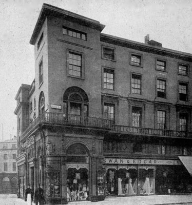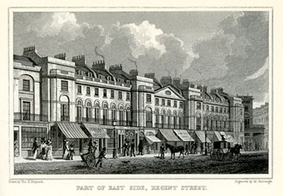 By the completion of the Pavilion in 1818, Nash had embarked, with the Prince Regent’s interest, in the remarkable and eventually comprehensive Regent’s Park urban redevelopment scheme for London.29 The scheme and Nash’s architectural palette displayed the cultural goods of British overseas commerce while instituting a remarkable system of goods and services for modern urban living. His street facades borrowed licentiously from many historical sources, chiefly ancient Classical. Those borrowings represented a commerce of taste or, more properly, of fashion in support of new forms of commercial practice and commodification of everyday life.30 Historical motif, extracted from antiquarian publications and bibliographic commerce, operated as a visual mechanism of selling—whether of insurance as in the Neo-Palladian County Fire Office, or temporary accommodation as in the Neo-Greek Piccadilly Hotel (each on Piccadilly Circus, 1818-1819), or women’s hosiery and apparel in the eclectic Classical Swan and Edgar’s store (on Regent’s Street, 1819-1821).