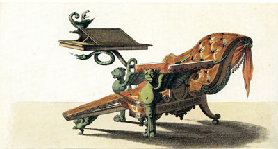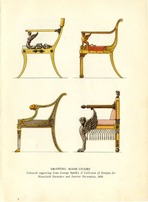 In concert with Emma and Austen’s other novels, “The Haywain” and Constable’s major landscape paintings became iconic images of Britishness and thereby involved in the later Victorian official and popular projection of the British regime. That regime rested upon many less attractive places and practices. Those unquiet sites and disquieting systems did, as noted, infiltrate Austen’s fiction. Nevertheless their relative insignificance has caused recent academic scrutiny to convict her of negative Orientalist tendencies and even of imperialist collusion.8 This paper will seek to modify such postcolonial critique by considering the caste of Orientalist sensibility at work during the Regency with particular respect to such contemporary constructions of English culture as written by Austen in Emma. The precise temporal definition of the Regency remains the political arrangement of the Prince of Wales’s regency 1811-1820 (prior to his coronation as King George IV), but this paper accepts its customary extension of 1800-1837, the period spanning the Napoleonic Wars and the ascension to the throne of Queen Victoria.9 That longer period enables a broader analysis of the range and operation of imported cultural materials and models in British design. It presents a picture of more random than truly concerted appropriation, in which the exotic is not so much an agenda of othering, or culturally expressed political subjugation, as of aestheticized commercial opportunism. In the increasingly technological frame of social and cultural activity associated with the later modern era, the imprint of such eclecticism is most evident in the furnishings of everyday life. The intermixture of acquisitive antiquarianism and elegant utility is especially evident in Regency furniture: as in those “Drawing Room Chairs” shown in George Smith’s A Collection of Design for Household Furniture and Interior Decoration (1808), or “Pocock’s Reclining Patent Chair” illustrated in the March 1813 issue of Ackermann’s Repository.
