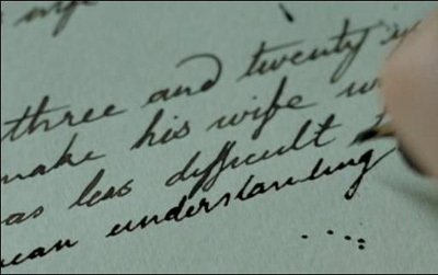 Finally, Shakespeare’s writing process prefigures Austen’s. In Viola, the playwright finds his muse; Austen finds a male muse in Tom Lefroy. While Shakespeare starts composing his masterpiece immediately after seeing Viola for the first time at the ball, Austen pens the initial pages of First Impressions, the original version of Pride and Prejudice, the night before Tom talks to his uncle about their engagement. The image of both writers at work is very much alike: they scribble their manuscripts in an old-fashioned handwriting with the help of quill and candle. The two movies shoot these scenes similarly, emphasizing elements like the writing materials, the authors’ dirty manuscripts, and their handwriting. With these long shots, the biopics stress Shakespeare’s and Austen’s professional career.
