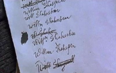 There are two main similarities in the movies’ beginnings. Shakespeare and Austen both are suffering from serious creative blocks, and they are writing trash when the films open. Shakespeare is unable even to start Ethel, the Pirate’s Daughter while Jane Austen pens dull prose, with difficulty completing a short piece on her sister’s engagement. The frustrated writers are portrayed at their working desks trying to scribble just a few lines. With dirty fingers, Shakespeare complains about the loss of his Muse. Meanwhile, he scrawls an untidy manuscript in a handwriting, to a modern eye, somewhat like Jane Austen’s, both the fictional and the real one.1 In her night gown, the novelist similarly struggles with her pen, trying to find some of her missing inspiration in music while the chiming clock signals the passage of unproductive time.