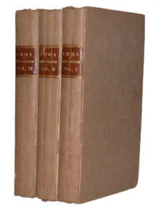 The authenticity of a binding carries more weight in today’s rare-book market than aesthetics or function. For example, Peter Harrington Antiquarian Books advertises a first edition of Emma for $42,087.18 with the following promotion: “We think it likely that this copy was not bound on purchase like most copies, but rebound sympathetically in keeping with the original at a slightly later stage, when the fragile boards disintegrated.” In comparison, they promote a much more attractive and well constructed, yet less expensive first edition for $30,863.93: “Contemporary mottled calf, neatly rebacked to Regency style, covers with gilt scroll borders.”