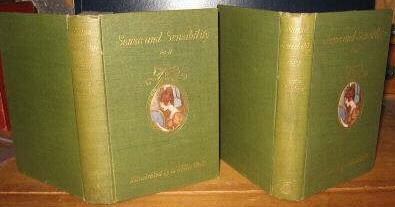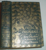 Other editions, however, targeted consumers who purchased Austen quite deliberately, even if only to impress others. These editions were not for travel but for enjoyment in one’s home or for display. For example, in 1892 J. M. Dent issued The Novels of Jane Austen in Ten Volumes, in “[g]reenish-white smooth cloth, spine gilt, upper board gilt with title and volume number . . . in a cartouche topped with the Austen crest, and a facsimile signature” of Jane Austen (Gilson 263-64). Two years later George Allen issued Pride and Prejudice in what came to be heralded among elite circles as the “‘Peacock’ design, . . . all edges gilt” (Gilson 267). In 1908-1909 Chatto and Windus produced a limited edition for which the front board of each cover featured a small, oval, color illustration reproducing a watercolor drawing by Wallis Mills. Over the next decade or so, among book owners who could afford to buy books for their covers—for décor—a book’s cover, as apart from its content, began to become an emblem in and of itself.