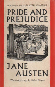In 1938, the Penguin Press revived the illustrated cover for Austen novels. To distinguish its classics series from its fiction series, Penguin hired artists (and credited them on the front cover) to illustrate a selected scene for the cover of the novel. These covers were the first to use an illustration of a scene from the novel since the infamous yellowbacks. A wood engraving by Helen Binyon graced Pride and Prejudice, No. 2 of the Illustrated Classics series of 1938 (Gilson 312).