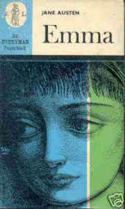The cover of the 1965 Everyman paperback Emma, on the other hand, features a close-up of a young woman’s face seen through a blue and green screen of color. Her distressed, huge eyes look to one side, like a rendition of a Warhol-like silkscreen print. These covers link the novels to current times, contemporizing Austen’s themes rather than confining them in another time and place in the manner of reproductions of early nineteenth-century art.