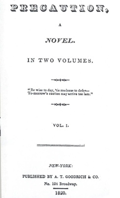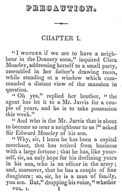 The very first page of Precaution shows its debt to Austen in a conversation establishing that a new neighbor is the rightful property of some one or other of the neighborhood daughters. No attentive reader of Austen could possibly miss the echoes of Pride and Prejudice in this opening (quoted from Cooper’s second, corrected edition):