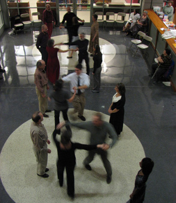 Perhaps nowhere did this group “break out of the cases” to better effect than at the opening reception for their display, where a group of English Country Dancers soon had the students, faculty, librarians, family members, and guests from the community dancing in the library lobby in proper Regency style to period tunes (Fig. 8). “I finally get all that dancing in the novels!” exclaimed one seminar student afterwards. Accustomed to active learning through their work on the exhibit, the students were not only willing to attempt the complicated maneuvers and changes of partners in the country dances but also perceptive enough to “get” thereby the crucial social interaction involved in dance scenes in Austen’s novels and to grasp the ways in which some of the moves prefigure prospective marital harmony. And they also began to see the library in a new light, as a place where learning could be fun and interactive as well as challenging in surprising ways.
