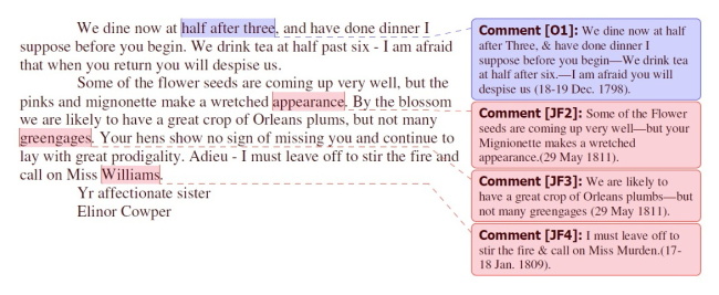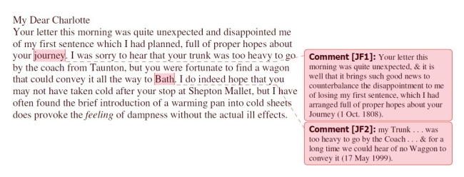 As the illustration shows, the first sentence here, like the salutation, is borrowed from a specific Austen letter, dated 1 Oct. 1808, but not quite word for word: “Your letter this morning was quite unexpected, & it is well that it brings such good news to counterbalance the disappointment to me of losing my first sentence, which I had arranged full of proper hopes about your Journey.” We have here a sisterly joke on the conventions of correspondence. Though Elinor’s letter alters the noun “disappointment” into a verb, “disappointed,” both openings insist on the joke that letters follow certain rules. One must produce “proper hopes” about a trip, and getting the news of the trip early means those conventional hopes have to be jettisoned. Already we see that Elinor and Charlotte, like Jane and Cassandra, enjoy closeness and share some humor at least about what goes on when conventional banalities are exchanged.