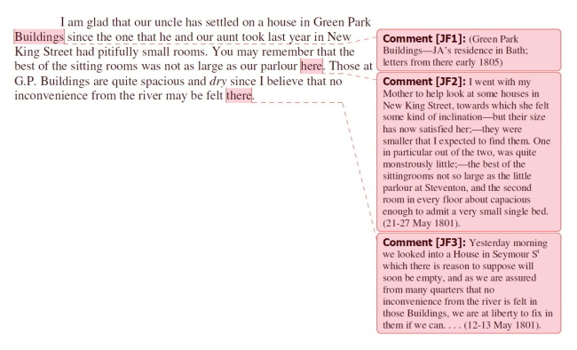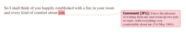 In paragraph two, there is an interesting difference between Elinor’s “So I shall think of you happily established with a fire in your room and every kind of comfort about you” and the original, written from a room in Austen’s formidable aunt’s house in the Paragon at Bath: “I have the pleasure of writing from my own room up two pair of stairs, with everything very comfortable about me” (5 May 1801).