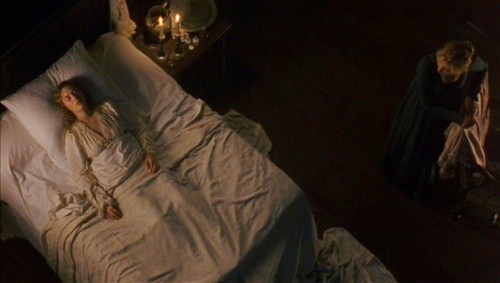 This is perhaps the most striking scene in Ang Lee and Emma Thompson’s 1995 film Sense and Sensibility (which, I readily admit, I regard as the gold standard of Austen films).  Lee and Thompson highlight Elinor and Marianne’s relationship all of the way through, with Elinor’s endless surveillance of her sister, their sleeping together in the same bed, and Elinor’s regular stroking of Marianne with affection.  Compared to the 1971 BBC version and the recent 2008 Masterpiece/BBC production, Kate Winslet’s Marianne is less sweet and innocent, and substantially more mocking and dismissive of her sister.  The 1971 and 2008 productions don’t play the scene as a confrontation, but rather as just another moment where Marianne disappoints Elinor.  Elinor in both of these films reacts more in sorrow than in anger, disappointed but not surprised. .