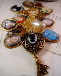 In addition to the iconic quality of the Jane Austen Bracelet of Charming Charms, it also immediately suggests femininity. The vintage cameos, flowers, hearts, and lockets are all symbols typically associated with femininity, fitting, considering that Jane Austen’s contemporary fanbase is mainly comprised of women. Here Jane Austen is drawn upon as a symbol, representing a woman who, through her writing, defies the gender roles of her time but who is, nevertheless, distinctly feminine. This Jane Austen is a model of the bricolage identity practices that girls can draw upon for inspiration.