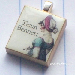 Take, for instance, the “Team Bennett” charm that I found on Etsy.com. This charm, provided by the seller “prettywhimsical,” evokes nostalgia through the image of the girl in classic Regency dress, which stylistically mimics the illustrations of Austen’s contemporaries. However, the phrase “Team Bennett” references the internet shorthand means of showing one’s allegiance in pop-culture debates by choosing a “team”: for example, “Team Coco” refers to the late-night network television battle between Conan O’Brian and Jay Leno for the Tonight Show time slot. This text, with its low-stakes pop-culture reference, subverts and denies the preciousness of the illustration. Nevertheless, the very presence of the illustration on the charm demonstrates that the wearer does embrace nostalgia. The charm provides an ironic distance that allows the fan to playfully embrace, explore, and perform within both modern and nostalgic modes without being fully committed to either.