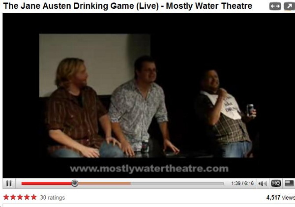 One example of a masculine artifact is “The Jane Austen Drinking Game” on YouTube, a live recorded performance of a comedy skit. This skit specifically addresses the issue of masculinity and Austen fandom. In this skit, the actors watch Sense and Sensibility, drinking only when one of the following appears in the film: inadequate dowry, small dogs, womanly skill, woman losing her countenance, retention of countenance, spontaneous equestrianism, falling in love, esteem and/or regard, and failure to observe rank. Part of the humor of this skit stems from the fact that as a culture we expect men to be dumbfounded by the concepts mentioned as drink-worthy here. Even knowledge about inadequate dowries and failure to observe rank, which aren’t particularly feminine topics, are often assumed to be part of the feminine realm, in part because they are associated with Austen, who is increasingly perceived as a writer for women.