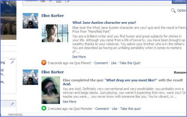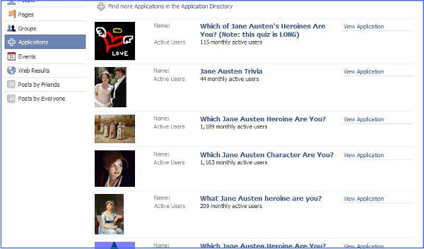 An example of this practice can be seen on Facebook, an online social networking community that compiles user profiles. On Facebook, there are numerous “quiz” applications that, through a series of questions, purport to tell the quiz-taker, for instance, which Jane Austen character she is most like. After taking the quiz, the user can choose to display the results on her profile, thereby allowing her friends to see her results too. There are twenty-nine different Austen-related quizzes available on Facebook. According to one quiz, I was most like Marianne, another declared that I was Anne, and another was sure I was Lizzy. That said, had I really wanted to “be” Emma, I could have selected the answers that most resembled how she would react to a given situation and “got” her in the end.
