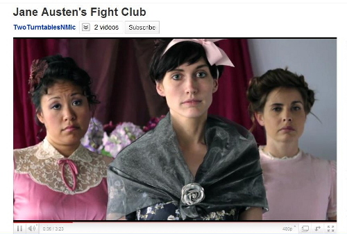A more robust example of this dynamic might best be seen in the viral YouTube video “Jane Austen’s Fight Club,” an amateur-produced, artificial trailer for a “film” about Austen characters who create a fight club, à la Chuck Palahniuk. The characters create this club to escape a life that “had become an endless surrender to propriety.” On the one hand, the video features faux British accents, homemade “Regency” dresses, pretty props like tea cups and croquet sets, and surprisingly beautiful sets; in other words it is a kind of play that revels in nostalgia, a literal dress-up session. On the other hand, part of the fun of the video is the way in which the young actresses tear apart these precious nostalgic elements. The creators of this short film frame the descent of Austen’s characters into chaos around their rejection of gender roles, stating first in a resigned voiceover that “a lady had her duties, her expected accomplishments, her polite affections, and the primary objective to marry or, for all intents and purposes, perish,” and then implying that the fight club, by allowing the women to reject these roles, provides transcendence and growth.