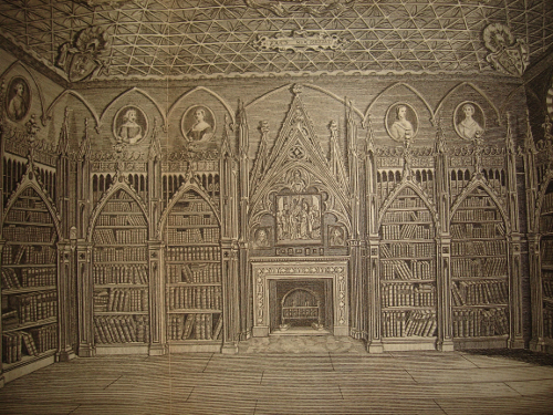 This apartment is fitted up in a unique and superlative style. The light is admitted by an oriel at the southern extremity, by two gothic windows on the eastern, and five on the western side. The upper compartments of the lattice are of painted glass representing various family arms. (59)