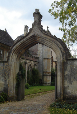 While approaching Northanger, a “surprized” Catherine “pass[es] between lodges of a modern appearance, to find herself with such ease in the very precincts of the abbey, . . . without obstacle, alarm or solemnity of any kind” (161). The drive at Lacock Abbey, however, swings right and through this splendid Gothic Revival arch and delivers the visitor to the front door. This part of the building is a wonderful prelude for what is to follow.