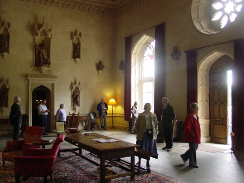 built in the ancient baronial style, seventy eight-feet high, sixty-eight feet long, and twenty-eight feet wide. The oak roof appears particularly striking and is decorated with sixty-eight shields, emblazoned with various family quarterings.