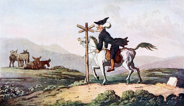 The sentimental doctrine of Benevolence to which Marianne refers was paralleled in the aesthetic sphere by the Picturesque, for as Gilpin wrote, “The general idea of the scene makes an impression before any appeal is made to the judgment. We rather feel, than survey it” (50), adding that the imagination, unfettered by reality, “can build castles” where none exists (56). Gilpin’s theories were hilariously burlesqued in The Tour of Dr. Syntax in Search of the Picturesque (1809). Rowlandson’s Plate 2 shows Dr. Syntax, a would-be landscape artist, stranded on a barren plain with his broken hack Grizzle, staring at an unreadable signpost.