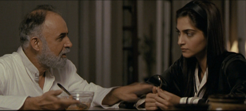 Most important, in this half of Aisha, the urban location does not dominate; instead, the film allows a greater sense of introspection, watching, judging, mistaking, as the camera follows the characters observing each other and gauging each other, often in silence. In fact, if the entire film had the quiet emotion of some of these scenes, the sense of old bonds perhaps being broken forever, the movie would have been greatly improved, and closer in tone at least to the melancholy of the third quarter of Emma. An example is the scene in which Arjun comes into his sister-in-law’s hospital room to meet his new niece, and finds Aisha there as well; his brother, filming him with a hand-held camera, chides him for his downcast expression. Only the viewer knows the source of his gloom, let in on the secret of his devotion to Aisha very much as we are in Volume III., chapter 5 of the novel. One also thinks of the sensitivity and heart of the scene between Aisha and her father as they meet in the kitchen and share a bowl of halwah once she has returned to Delhi. Not deriving from Emma in the least, this tête-à-tête owes much more to the father-son chat that catapults Raj into his trip to from London to Punjab to stop the wedding of his beloved Simran in the biggest Bollywood hit of them all, Dilwale Dulhania le Jayenge (still running in theatres sixteen years after its release).