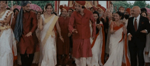 5. Western audiences might not understand how to interpret the kissing scene. Kissing is extremely rare in Indian cinema because it is considered indecent for actors to have that kind of physical contact. Though mores are changing, actors who do not kiss on screen enjoy the added respect of an audience that judges between those who acknowledge the intimate value of kissing and actors who violate that intimacy. Only the Dhruv/Aarti and Randhir/ Pinky couples kiss in this film. Thus, the two more innocent couples, Aisha/Arjun and Shefali/Saurabh, who do not kiss, are elevated above the baser couples, the Eltons (Randhir and Pinky) and the Churchills (Dhruv and Aarti).