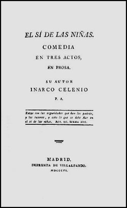 Moratín served his king as one of the most important writers concerned with this situation. Before El sí de las niñas, he wrote El viejo y la niña (The Old Man and the Girl, performed for the first time in 1790). The alliance between love and marriage was very convenient to His Catholic Majesty in his efforts to put an end to this upper-class custom. At the end of the Old Regime, the absolutist monarchy tried to adapt its propaganda to the new times, and marriage for love was one of its tools.