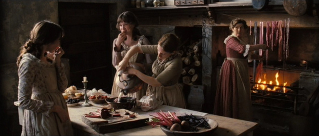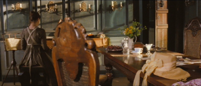 More important, the temporal change requires a very fluid camerawork. If painterly, frames are never static: thanks to Roman Osin’s cinematography, relying on long and complex tracking shots, the animation in the scenes fades into the movement of the scenes. Life pervades the visual field in its natural, animal, and human components. The sounds of nature, birdsong (especially of blackbirds), the permanent presence of dogs, chickens, pigs, and geese create a realistic, kinetic picture, which brings to the center of the frame particulars usually left offstage in costume dramas and in the customary Regency adaptations of Jane Austen. The long tracking shot during the first sequence follows Elizabeth as she is coming home: though establishing her as the privileged focal subject of the film, the camera soon leaves her in order to sneak into the house, gliding from room to room through doors and windows, showing its messiness and noisiness. After tracking in, from behind, to Mary (Talulah Riley) playing the piano, in a visual composition reminiscent of Vermeer, the camera rambles around the room dwelling on details of dress, decoration, and furniture, taking in the ribbons, flowers, and books scattered on the table. Just as in a Flemish painting, the sunlit environment, with the Veermerian predominance of blue and yellow shades, radiates an atmosphere of hearty domesticity in which people are caught in their different activities.