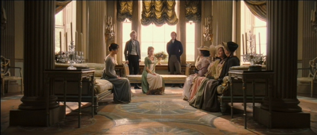 Throughout the film, however, the bright household of the Bennets is repeatedly contrasted with the stiffness of the aristocratic manors. Not only are the hours at Netherfield punctuated by the repetitive sound of the clock, but the characters are, as a rule, seated; if walking around the room, as Elizabeth and Miss Bingley do, their movements are as affected as if determined by stage directions.