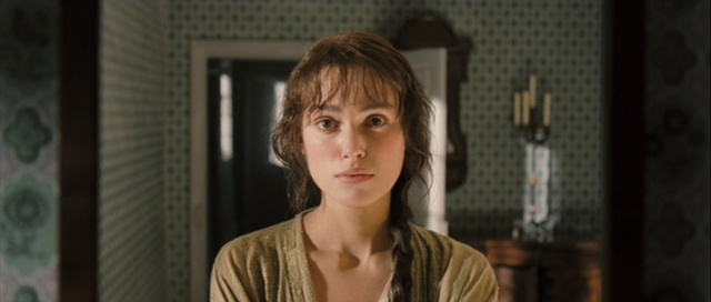 A common trope for self-revelation, the inclusion of the long mirror shot answers the double purpose of giving palpable form to Elizabeth’s revision, while conveying the passing of time. More important, this reflexive gaze marks the crowning moment of subjective identification between viewer and character since Knightley is actually looking at the camera. In other words, we are Elizabeth.