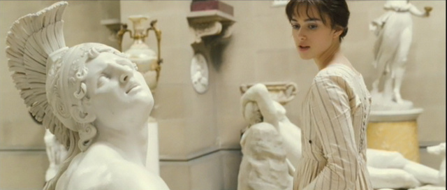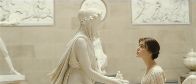 Moreover, Elizabeth’s acquaintance with Pemberley is portrayed as a sensory experience: she touches everything, even running her hands over a statue of Janus—tellingly, the Roman guardian of doorways and gates. The whole sequence centers less on Elizabeth’s knowledge of Darcy than on her self-image, here given the bodily form of a sculpture. With a round shot, the camera holds on her contemplation of a statue of a woman whose veiled features are the artistic embodiment of Elizabeth’s mental state. If not still in the darkness of Hunsford Parsonage, metaphorically her face is still invisible, yet the veils of prejudice and self-deception seem now reduced to thin layers.