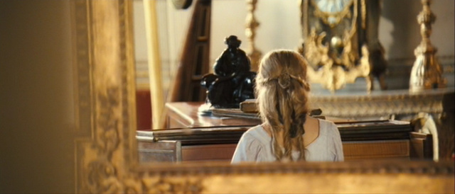 On the other hand, Austen’s playfulness and the story’s romantic flavor are acoustically evoked by blurring the boundaries between the background and the source planes in a network of returning tunes and techniques. Once again, the first sequence is essential in establishing this musical interplay: the English countryside seems to wake up to the sound of blackbirds twittering (from now on Elizabeth’s sound motif), which then fades into the main theme, a piano sonata entitled “Dawn,” whose first, hesitant notes start at the first rays of sunlight. As soon as the camera reaches Elizabeth’s home, it moves in and holds on the back of a girl (Mary Bennet) at a piano, who is naturally identified as the player of the theme. Ironically, this first impression is soon denied by the dull sound of scales overlapping for a brief moment with the main score. In the span of a sequence, the film’s main topic and its narrative intermixing of real and unreal are woven into the musical texture. Wafting through the misty landscape of Elizabeth and Darcy’s final scene, the piano sonata implements musically the paradigms of circularity and repetition. Its mesmerizing melody resounds with flowing or melancholy modulations from sequence to sequence, both as background music and source music, first played, and very badly, by Elizabeth at Rosings, and then superbly executed by Georgiana Darcy at Pemberley. The piano leitmotif is even awarded narrative relevance, becoming the means for the two lovers’ meeting at Pemberley as Elizabeth is attracted to the door by the familiar sound of the piano sonata. Besides re-enacting the opening tracking shot of the film, the scene further replicates Elizabeth’s own performance of the piece. These echoes are visually suggested in the mirror that reveals Georgiana’s figure, and the musical theme prefigures Pemberley as Elizabeth’s future home.