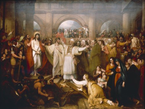 West combines two different events related to the crucifixion—involving Caiaphas and Pilate—to create a “dramatic production” in which many of the actors in the crucifixion come imaginatively together around the still Christ at upper left, whose calm demeanor contrasts with the strong emotions of the others present (Evans 97-99).