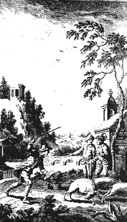 In order to analyze Graves’s satire at work, a little background is first needful on the Roman Columella. Writing in AD 60-65 in very pragmatic terms, dealing with agrarian life and how to live sustainably from the land, the Roman Lucius Junius Moderatus Columella (whose name in itself sounds like a satire) criticizes the wealthy who retreat to the land as relief from the cities, and practice unwise husbandry. As early as the Preface to De Re Rustica, he lambasts the ridiculous methods of the rich man who, “if [he] purchases a farm, out of his throng of footmen and litter-bearers, . . . sends off to the fields the one most bankrupt in years and strength, whereas such work requires, not only knowledge, but the age of vigour and physical strength as well, to endure its hardships” (11). Such criticism is borne out by the various incompetent servants the English Columella hires to care for the land that he has inherited and to which he has retreated as an aesthete and recklessly farms. Indeed the reader’s first view of the English Columella—also represented in the frontispiece to the first volume—is of him “running across the lawn, with a faggot-stick in one hand, and a book in the other,” cursing the pigs that had “routed up all [his] primroses and periwinkles . . . planted in [the] shrubbery” (Graves 1:45-46).1
