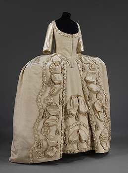 It is said that Ginger Rogers danced everything that Fred Astaire did but backwards and in high heels, but even Miss Rogers’s skill might have been taxed by the formal court hoop. Very wide skirts of a rectangular shape—so wide that ladies had to turn sideways to pass through doorways—had been the kick of fashion in the 1740s, but hoops were retained for court wear until Queen Charlotte’s death in 1818. Indeed, ladies who wished to dance minuets at Bath or other public assemblies were also required to wear court hoops and lappets (streamers of lace depending from the backs of their head-dresses). The hoops changed shape slightly over the years, until by 1806, in a nod to the high-waisted fashion popular then, they projected out directly from under the breasts.