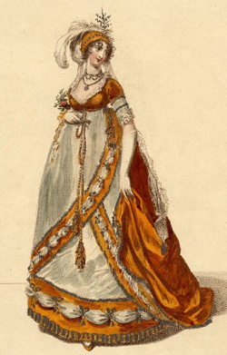 The anonymous reporters of court events in monthly magazines like The European Magazine and London Review provided exhaustive detail on the gowns that individual noble ladies and gentlemen wore. For example, at the celebration of the Queen’s birthday in 1787 noted above, the reporter wrote that the King wore purple velvet, embroidered with gold, with diamond buttons and a brilliant diamond star; the body of the Queen’s dress was lemon satin, with a coat of white crepe gauze adorned with rows of black lace and blue ribbons; and the two princesses were dressed alike in gold tissue (50-51). Fashion magazines like La Belle Assemblée provided even more detail, as when describing the court dress of the Princess of Wales worn for the celebration of the King’s birthday on 4 June 1807. After the standard panegyric on how the princess’s dress was “superior for taste and magnificence to all others,” the reporter noted,