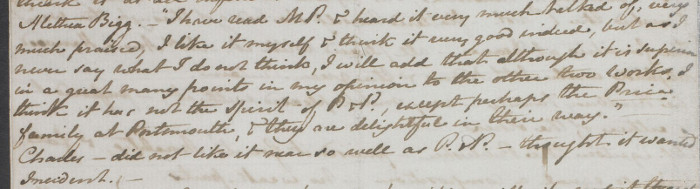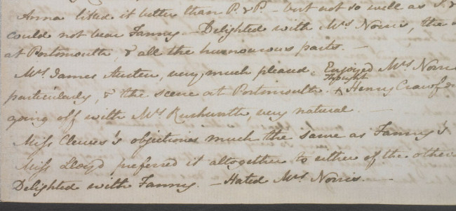 I have read MP. & heard it very much talked of, very much praised, I like it myself & think it very good indeed, but as I never say what I do not think, I will add that although it is superior in a great many points in my opinion to the other two Works, I think it has not the Spirit of P & P., except perhaps the Price family at Portsmouth, & they are delightful in their way. (233)