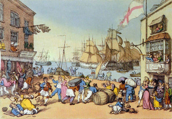 There was a seedy aspect of the town, however, to which Austen’s text unflinchingly nods in several places. Portsmouth was, like London and Manchester, among England’s fastest growing towns in the eighteenth century; the burgeoning ranks of dock- and mill-workers needed to commute daily by foot, which in turn led to the hasty erection of inferior, densely packed housing (Girouard 258-59). Although not yet designated a city, Portsmouth had a population of around 7,000 and did not lack for urban troubles (Thomas 61). Along the town’s High Street one would find “handsome Georgian houses with shops catering to the affluent,” but just off it were “filthy streets, appalling slums and abject poverty,” B. C. Thomas writes (61). As a port for sailors and marines awaiting orders or returning from sometimes years-long expeditions, there was no shortage of “Rears and Vices” to be found.3 In a 1794 diary entry, evangelical William Wilberforce wrote of Portsmouth Point: “wickedness and blaspheming abounds—shocking scene” (qtd. in Southam 218). The town’s rough reputation is captured well in period caricatures, such as Thomas Rowlandson’s 1811 “Portsmouth Point.” In this image, the proud harbor, crowded with ships and with smaller boats scuttling to and from shore, is foregrounded by the more vivid colors of exuberant port bustle and open-air carousing. It is hard to imagine modest Fanny Price stepping through such a picture, and Mrs. Price is surely not exaggerating in her lament to Henry Crawford that her daughters “‘were very much confined—Portsmouth was a sad place—they did not often get out’” (MP 466). Unlike Bath or nearby Southampton, where Austen briefly attended school and later lived with brother Frank’s family, Portsmouth was not known as a town in which genteel ladies could stroll in safety.