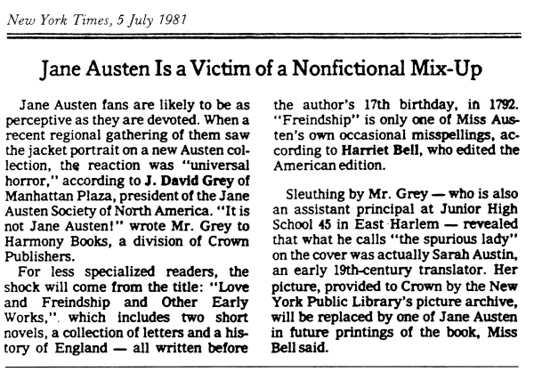 The recent publication of a new edition of Love and Freindship, with a portrait on the cover of someone who was not Jane Austen, sent shock waves through the ranks of Austen lovers everywhere. Our President, J. David Grey, established the identity of the “wrong” picture, which turned out to be that of Sarah Austin, a nineteenth-century translator and writer on education, – a lady well-known in her day, but not the author of the book in question.