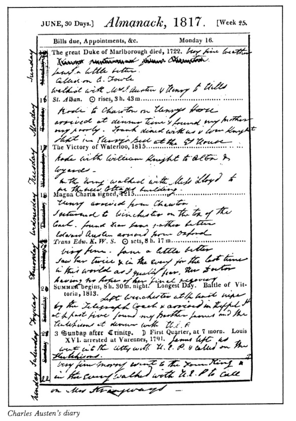 (Spelling and punctuation as in the original.) Charles visited Chawton in July of 1820. He mentions driving Cassandra in a donkey cart (Jane’s) to Alton and visiting Selborne with her and Mrs. Digweed. Cassandra’s death on March 22 is recorded in the diary for 1845. This information was gleaned from a cursory inspection of two-and-a-half feet worth of volumes. More awaits closer scrutiny, but it is evident in this brief sampling that Charles was not only devoted to his Dear Jane but to all the other members of his family as well. The books are peppered with mentions of Frank and James and here is what he has to say on the occasion of Henry’s birthday, 1816.