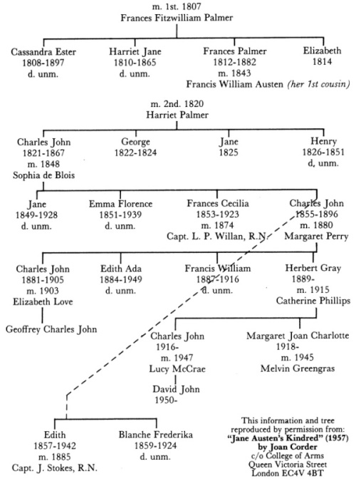 PEDIGREE It is of interest that although Charles’s son, Charles John, became a naval officer, he died young and the family fell on evil times. His son Charles John became a telegraphist, and his son, Charles John drove a bread van, while his brother, Francis William was a grocer’s assistant. Some of Admiral Charles Austen’s descendents live in North America. |