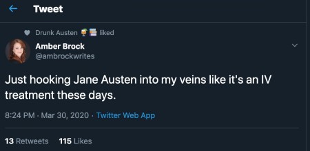 Reading her novels, watching adaptations, and writing about them in texts as small as tweets and as large as memoirs give us the means to take a break from our lives, understand them better, and connect with others who may be experiencing something similar. In 2020, a global pandemic, seclusion, and distancing generate the need. In the past, war or medical convalescence might have done so, and in the future, it might be something equally isolating. Whatever the case, the Austen treatment is one that helps us cope with our circumstances. When posed the question asked by the author of a NovelTea Tins Facebook post—“Is Jane Austen anyone else’s therapist?”—I say yes. Austen is our therapist right now and, as Amber Brock’s tweet suggests, the medicine we need, stat:
