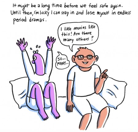 A number of Austen-themed articles and posts appearing during the pandemic have used humor to address isolation, some wittily imitating Austen’s “and” novels to extend the comparison. “Sense and Social Distancing” appears in more than one title, and Lisa Hanawalt’s New Yorker comic “Pride and Pestilence” illustrates how in difficult times people “search for comforting things,” like the 2005 Pride and Prejudice, “to watch while social-distancing.” Still, humor also isolates real concerns, for Hanawalt proclaims, “The pandemic is many of my worst fears come true, and it’s too much to process day-to-day.” It is an “invisible killer” that has made us feel “powerless.” But in the end—as shown below in the last panel of the comic— biblio- and cinematherapy help us cope with “anxiety and boredom.”