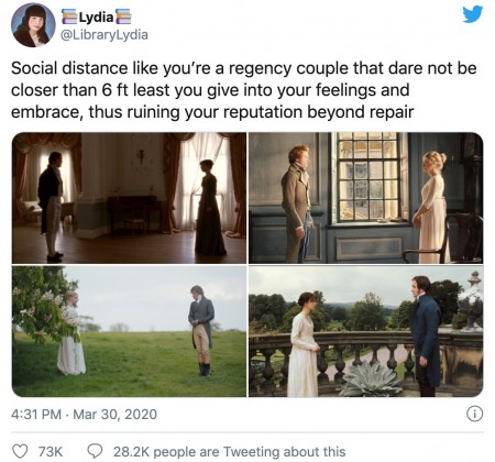 Rather than chafing against being stuck with people—even those you love—some have bemoaned being single during the pandemic and compared it to Austen’s novels. Included in the byline of “Sense and Social Distancing” is a summary—“isolated, socially distant, and unable to touch anyone: the single life under COVID-19 is eerily Jane Austen-esque.” The article includes @LibraryLydia’s tweet and draws on Austen films to visualize social distancing in Austen’s time alongside ours: