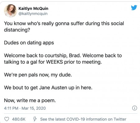Once this pandemic is over, maybe people will think about the things they took for granted, like being able to go to an indoor public place with someone on date. The pandemic truly has shown how difficult it has been for people to date in 2020, and unsurprisingly “This is What Dating Is Like During the Coronavirus Pandemic” brings Austen into this problem. It shares @kaitlynmcquin’s tweet, which jokingly likens dating in our time to Austen’s: