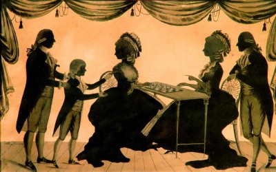 As the Austen boys entered their teens, all would be wearing breeches. Only long, loose hair and ruffled shirt collars would indicate they were not yet adults: we can picture them looking something like Thomas Abraham (Figure 15). This speculation is confirmed in part by the 1783 silhouette depicting Edward Austen joining the Knight family (Figure 16). He sports short bangs and loose hair falling to his shoulders; his shirt collar appears slightly shorter than the adults’ and seems to be folded over, but his suit follows adult fashions. (Since he was well into his teens at this point, when all boys would be in breeches, the silhouette provides no clues to how early the elder Austen boys were breeched.)