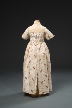 Once walking, toddlers required shorter garments. Before being toilet-trained, boys as well as girls were sensibly clad in frocks over a slip. (Costume terms sometimes refer to two or more different garments: in this case, the slip is an under-dress.) As depicted in portraits, these slips are invariably made of white cotton (muslin), but several printed cotton and linen ones survive and were surely common for everyday wear (Figure 4). In the early nineteenth century, Elizabeth Grant remembered wearing “stuff,” i.e., wool dresses, when muslin had all but conquered fashion (qtd. in Buck 204); it seems likely that wool was worn in cold weather throughout this period.